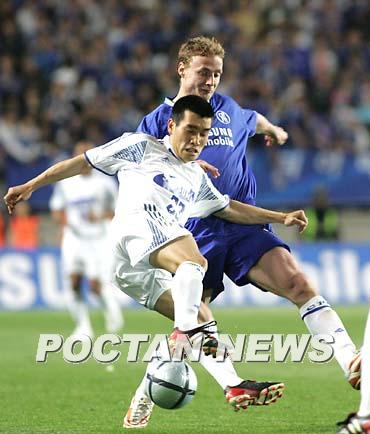 20일 수원 월드컵경기장에서 벌어진 잉글랜드 프리미어리그 2004~2005시즌 챔피언 첼시와 수원 삼성의 친선경기 후반 수원의 조원희가 첼시의 장신(195cm) 공격수 이리 야로식을 재치있는 동작으로 따돌리고 있다./수원=손용호 기자 spjj@poctannews.com (Copyright ⓒ 폭탄뉴스 www.poctannews.com 무단전재 및 재배포 금지)