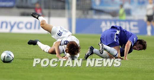 20일 수원 월드컵경기장에서 벌어진 잉글랜드 프리미어리그 2004~2005시즌 챔피언 첼시와 수원 삼성의 친선경기 전반전서 수원의 곽희주와 첼시의 스메르틴이 몸싸움을 벌인 끝에 둘다 그라운드에 나동그라지고 있다./수원=손용호 기자 spjj@poctannews.com (Copyright ⓒ 폭탄뉴스 www.poctannews.com 무단전재 및 재배포 금지)