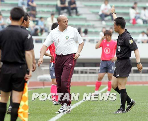 21일 부산 구덕운동장에서 벌어진 파크랜드컵 2005 부산 국제청소년대회 한국-모로코의 개막전 전반 30분께 백승민의 얼굴을 가격한 타리크 벤다무에게 경고가 주어지자 대기심의 만류에도 불구하고 경기장에 진입, 주심에게 항의한 자말 파티 모로코 감독에게 유병섭 주심이 퇴장을 명하고 있다./부산=손용호 기자 spjj@poctannews.com (Copyright ⓒ 폭탄뉴스 www.poctannews.com 무단전재 및 재배포 금지)