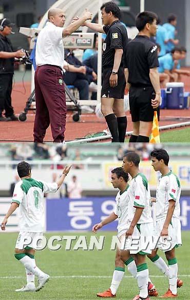 21일 부산 구덕운동장에서 벌어진 파크랜드컵 2005 부산 국제청소년대회 한국-모로코의 개막전 전반 30분께 백승민의 얼굴을 가격한 타리크 벤다무에게 경고를 주자 자말 파티 모로코 감독이 대기심의 만류에도 불구하고 경기장에 진입, 주심에게 항의하다 퇴장 당한 뒤 계속 벤치에 앉아 있더니 모로코 선수가 또 옐로 카드를 받는 상황이 나오자 선수들을 그라운드 밖으로 철수시키고 있다./부산=손용호 기자 spjj@poctannews.com (Copyright ⓒ 폭탄뉴스 www.poctannews.com 무단전재 및 재배포 금지)