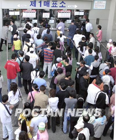 21일 LG 트윈스와 두산 베어스의 잠실 라이벌전을 보기 위해 잠실 구장을 찾은 야구 팬들이 매표소에 줄 지어 서 있다. 홈 팀 LG가 공표한 대로 이날 무료로 입장할 수 있게 된 전날 입장권 소지자들은 매표소에서 당일 입장권으로 바꿔 들어가면 됐다./잠실=주지영 기자 jj0jj0@poctannews.com (Copyright ⓒ 폭탄뉴스 www.poctannews.com 무단전재 및 재배포 금지)