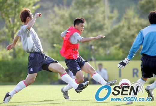 2006 독일월드컵 아시아 최종예선 우즈베키스탄, 쿠웨이트전에 대비해 24일 태극전사들이 파주 NFC에 소집돼 첫 훈련을 실시했다. 미니게임에서 정경호(가운데)가 골키퍼 김용대(오른쪽)를 앞에 놓고 슈팅을 날리고 있다./파주=손용호 기자 spjj@osen.co.kr [Copyright ⓒ OSEN(www.osen.co.kr) 무단전재 및 재배포 금지]