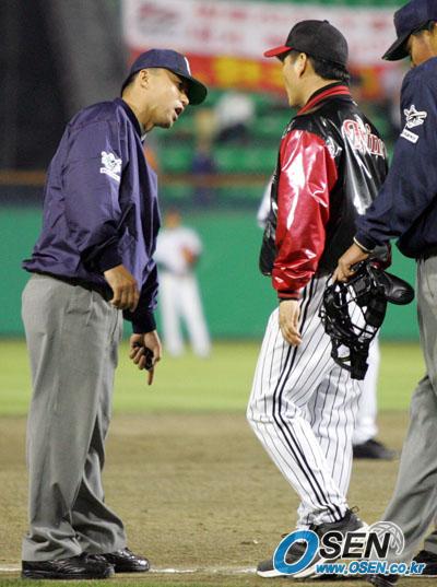 24일 LG 트윈스와 롯데 자이언츠의 잠실 경기 5회초 2사 3루서 롯데 정수근의 3루 선상 타구가 안타로 판정되자 이순철 LG 감독이 파울이라며 항의하고 있다. 이에 오훈규 3루심이 라인을 가리키며 페어볼이라고 설명하고있다./잠실=주지영 기자 jj0jj0@osen.co.kr [Copyright ⓒ OSEN(www.osen.co.kr) 무단전재 및 재배포 금지]