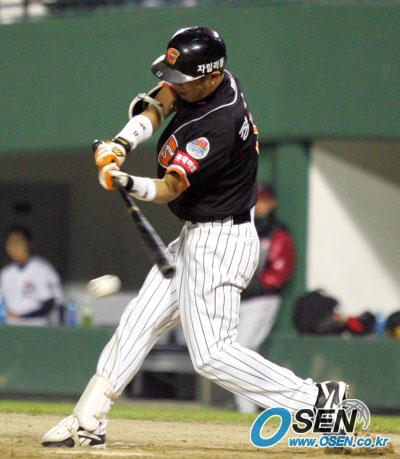 24일 LG 트윈스와 롯데 자이언츠의 잠실 경기 5회초 2사 3루서 롯데 정수근이 3루 선상 타구를 때리고 있다. 이 타구가 안타로 판정되자 이순철 LG 감독이 파울이라며 강력히 항의, 경기가 잠시 중단됐지만 판정은 번복되지 않아 정수근의 2루타로 기록됐다./잠실=주지영 기자 jj0jj0@osen.co.kr [Copyright ⓒ OSEN(www.osen.co.kr) 무단전재 및 재배포 금지]