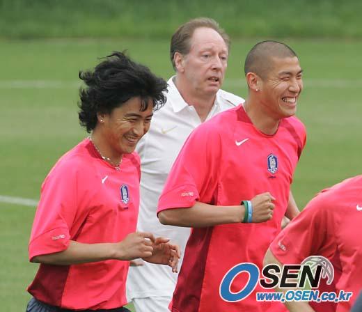 2006 독일월드컵 아시아 최종예선 우즈베키스탄, 쿠웨이트전에 대비한 국가대표팀이 25일 파주 NFC에서 소집 이틀째 훈련을 가졌다. 독일에서 지난 24일 귀국, 이날부터 훈련에 합류한 차두리(오른쪽)가 밝은 표정으로 안정환과 나란히 달리고 있다./파주=손용호 기자 spjj@osen.co.kr [Copyright ⓒ OSEN(www.osen.co.kr) 무단전재 및 재배포 금지]