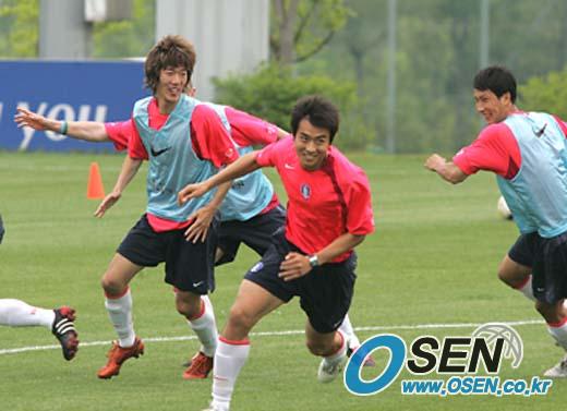 2006 독일월드컵 아시아 최종예선 우즈베키스탄, 쿠웨이트전에 나설 국가대표팀이 25일 파주 NFC에서 소집 이틀째 훈련을 가졌다. 함께 슬슬 뛰다 자리를 차지하고 뛰는 게임에서 이동국이 일찍 자리를 잡고 여유있게 달려가고 있다./파주=손용호 기자 spjj@osen.co.kr [Copyright ⓒ OSEN(www.osen.co.kr) 무단전재 및 재배포 금지]