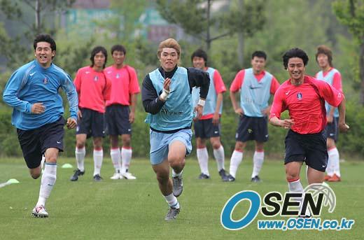 2006 독일월드컵 아시아 최종예선 우즈베키스탄, 쿠웨이트전에 나설 국가대표팀이 25일 파주 NFC에서 소집 이틀째 훈련을 가졌다. 단거리 스퍼트 훈련에서 안정환(오른쪽)이 골키퍼 김영광(가운데) 김용대와 조를 이뤄 달리고 있다./파주=손용호 기자 spjj@osen.co.kr [Copyright ⓒ OSEN(www.osen.co.kr) 무단전재 및 재배포 금지]