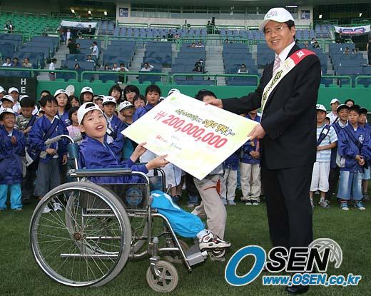 26일 인천 문학구장에서 SK 와이번스와 삼성 라이온즈의 경기가 열리기 전 (주)SK가 주관한 "함께 하는 마음, 행복한 대한민국" 의 행사의 일환으로 전국 소년 소녀 가장 650명에게 성금을 전달하는 행사를 가졌다. (주)SK 김명곤 전무가 연일 특수학교를 대표한 김동섭 군에게 2억 원의 성금을 전달하고 있다. /인천=손용호 기자 spjj@osen.co.kr [Copyright ⓒ OSEN(www.osen.co.kr) 무단전재 및 재배포 금지]