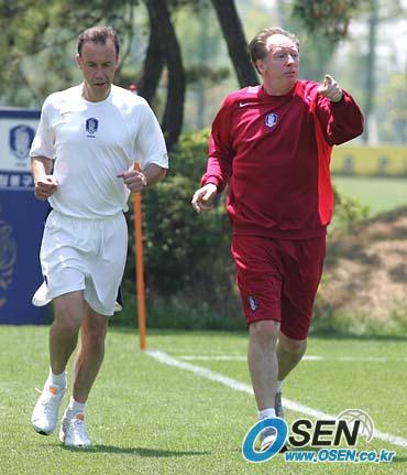2006 독일월드컵 아시아 최종예선 우스베키스탄,쿠웨이트와이 원정경기에 대비해 파주 NFC서 훈련 중인 국가대표 선수들이 27일에는 전날 경희대와 연습 경기를 치렀기 때문에 오전에 간단한 회복 훈련으로 소집 4일째 공식 스케줄을 마무리 짓고 오후에는 자유시간을 즐겼다. 훈련이 끝난 뒤 본프레레 감독이 야스퍼트 피지컬 트레이너와 함께 운동장을 뛰고 있다./파주=손용호 기자 spjj@osen.co.kr [Copyright ⓒ OSEN(www.osen.co.kr) 무단전재 및 재배포 금지]
