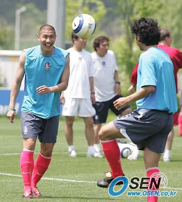 차두리가 안정환(오른쪽)고 패스를 주고 받으며 밝은 표정으로 훈련하고 있다. 2006 독일월드컵 아시아 최종예선 우스베키스탄,쿠웨이트와의 원정경기에 대비해 파주 NFC서 훈련 중인 국가대표 선수들이 27일에는 전날 경희대와 연습 경기를 치렀기 때문에 오전에 간단한 회복 훈련으로 소집 4일째 공식 스케줄을 마무리 짓고 오후에는 자유시간을 즐겼다. /파주=손용호 기자 spjj@osen.co.kr [Copyright ⓒ OSEN(www.osen.co.kr) 무단전재 및 재배포 금지]