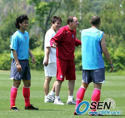 3, 4명씩 조를 짜 헤딩으로 패스하는 게임을 지켜보던 본프레레 감독이 안정환 차두리 김한윤 조를 찾아와 차두리(오른쪽)의 헤딩을 흉내내면서 그런 식으로 하며 어떻게 하냐고 말하고 있다. 2006 독일월드컵 아시아 최종예선 우스베키스탄,쿠웨이트와의 원정경기에 대비해 파주 NFC서 훈련 중인 국가대표 선수들이 27일에는 전날 경희대와 연습 경기를 치렀기 때문에 오전에 간단한 회복 훈련으로 소집 4일째 공식 스케줄을 마무리 짓고 오후에는 자유시간을 즐겼다. /파주=손용호 기자 spjj@osen.co.kr [Copyright ⓒ OSEN(www.osen.co.kr) 무단전재 및 재배포 금지]