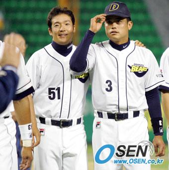 27일 SK 와이번스와의 홈 경기에서 9-2로 대승한 두산의 고참 최경환(33, 왼쪽)과 안경현(35)이 경기 후 여유있는 표정으로 관중석에 인사하고 있다. 두산은 전날 광주 원정 경기서는 6점차로 기아에 패한 바 있다./잠실=주지영 기자 jj0jj0@osen.co.kr [Copyright ⓒ OSEN(www.osen.co.kr) 무단전재 및 재배포 금지]