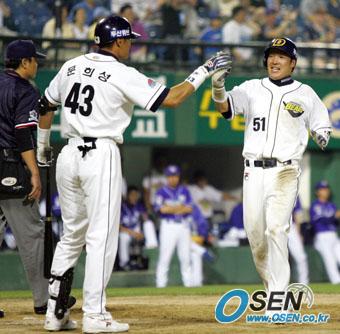 28일 잠실 구장에서 벌어진 두산 베어스와 SK 와이번스의 경기 두산의 5회말 2사 2루서 안경현의 좌전 안타 때 2루 주자 최경환이 여유있게 홈인, 5-2를 만들며 다음 타자 문희성과 하이 파이브를 나누고 있다./잠실=주지영 기자 jj0jj0@osen.co.kr [Copyright ⓒ OSEN(www.osen.co.kr) 무단전재 및 재배포 금지]