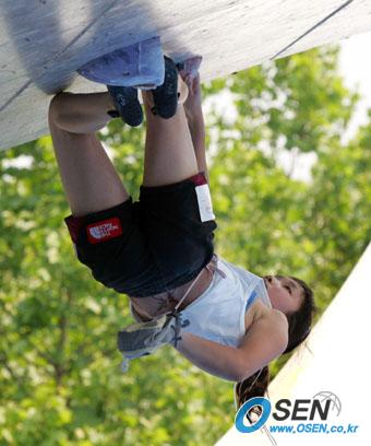 29일 잠실체육관 일원에서 2005 아시안 X게임 최종일 경기가 열렸다. 스포츠 클라이밍 여자 볼더링 결승전에서 예선 1위였던 한국의 김자인(17)이 벽에 거꾸로 매달린 채 손에 파우더를 묻히고 있다. 김자인은 4위에 그쳤다./주지영 기자 j0jj0@osen.co.kr [Copyright ⓒ OSEN(www.osen.co.kr) 무단전재 및 재배포 금지]