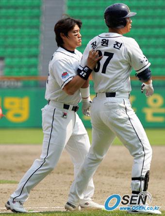 29일 잠실 구장서 열린 두산 베어스-SK 와이번스전서 3회말 2사 후 두산의 장원진(오른쪽)이 SK 구원 투수 이영욱의 투구에 맞은 뒤 마운드로 달려 가려는 것을 홍성흔이 말리고 있다. 두산은 2회에 강봉규 안경현이 연속으로 맞았고 장원진 다음 타자인 임재철도 사구로 나갔다./잠실=주지영 기자 jj0jj0@osen.co.kr [Copyright ⓒ OSEN(www.osen.co.kr) 무단전재 및 재배포 금지]