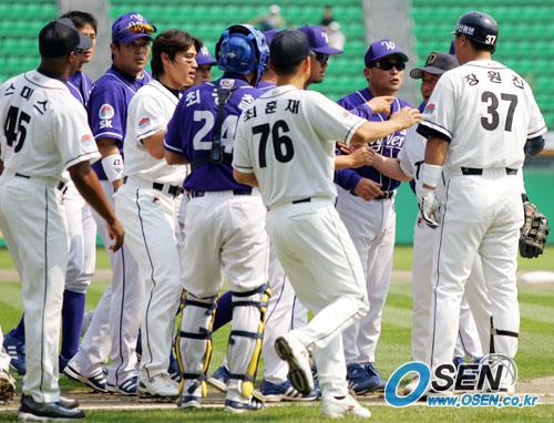 29일 잠실 구장서 열린 두산 베어스-SK 와이번스전서 3회말 2사 후 두산의 장원진(오른쪽)이 SK 구원 투수 이영욱의 투구에 맞은 뒤 마운드로 달려가려 하자 두산의 김광수 최훈재, SK의 박종훈 김상진 코치 등이 달래고 있다./잠실=주지영 기자 jj0jj0@osen.co.kr [Copyright ⓒ OSEN(www.osen.co.kr) 무단전재 및 재배포 금지]