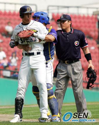 29일 잠실 구장서 열린 두산 베어스-SK 와이번스전서 3회말 2사 후 두산의 장원진(오른쪽)이 SK 구원 투수 이영욱의 투구에 맞은 뒤 마운드로 달려 가려는 것을 SK 포수 최경철이 껴안고 말리고 있다.두산은 2회에 강봉규 안경현이 연속으로 맞았고 장원진 다음 타자인 임재철도 사구로 나갔다./잠실=주지영 기자 jj0jj0@osen.co.kr [Copyright ⓒ OSEN(www.osen.co.kr) 무단전재 및 재배포 금지]