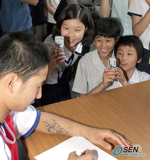 정몽준 대한축구협회장과 이천수가 학원 체육 활성화를 위한 행사의 일환으로 30일 오전 경기도 고양시 화정에 위치한 백양중을 방문 행사를 가졌다. 이천수가 사인해 주는 동안 옆의 학생들은 카메라폰으로 사진을 찍기에 바쁘다./고양=손용호 기자 spjj@osen.co.kr [Copyright ⓒ OSEN(www.osen.co.kr) 무단전재 및 재배포 금지]