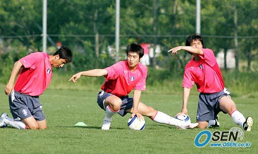 2006 독일월드컵 최종예선 우즈베키스탄으로 출국을 하루 앞둔 30일 오후 파주nfc에서 마지막 훈련이 열렸다. 게임을 하다 걸린 김상식이 풋샾을 안하자 이동국과 안정환이 손가락으로 가리키켜 이춘석 코치에게 일르고 있다./파주=손용호기자spjj@osen.co.kr [Copyright ⓒ OSEN(www.osen.co.kr) 무단전재 및 재배포 금지]