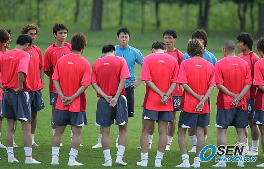2006 독일월드컵 아시아지역 최종예선 우즈베키스탄전을 하루 앞두고 30일 오후 파주 NFC에서 마무리 훈련을 가진 다음 본프레레 감독의 불호령이 떨어진 후 선수들간의 미팅에서 이운재가 후배 선수들에게 출국에 앞서 정신무장을 주문하고 있다. /파주=손용호 기자 spjj@osen.co.kr [Copyright ⓒ OSEN(www.osen.co.kr) 무단전재 및 재배포 금지]