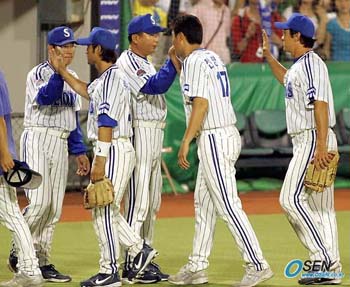 ‘사자 앞에만 서면 작아지는 거인'. 롯데가 '전병호 징크스’를 깨는 데 또 실패했다. 무려 9년 가까이 지속되고 있는 지긋지긋한 징크스다. 올 시즌 처음 선발 등판한 롯데 이명우와 ‘롯데 킬러’ 전병호의 맞대결. 삼성도 좌투수에는 아직 찜찜한 처지라 승리를 낙관할 수는 없었다. 삼성은 3회까지 매회 병살타를 치면서도 3점을 뽑은 반면 롯데는 5회까지 2점을 얻는 데 그쳤다. 삼성은 2회 2사 3루에서 7번 양준혁의 중전 적시타로 선취점을 뽑았다. 3회에는 롯데의 보이지 않는 실책에 편승했다. 무사 1,2루 찬스에서 박한이의 보내기 번트 타구를 잡은 롯데 포수 최기문이 3루수 이원석에게 공을 뿌렸다. 포스 아웃상황이었기에 번트 타구를 잡기 위해 대시했던 이원석이 재빨리 귀루만 했어도 잡을 수 있었던 상황. 그러나 근 한달 만에 1군에 오른 그는 아직 적응이 덜 됐는지 미적미적거리다 결국 올 세이프 되는 상황을 만들었다. 심정수의 유격수 병살타가 나왔지만 3루 주자 강동우가 홈을 밟아 2점째를 뽑았다. 4회에도 선두 조동찬이 볼넷으로 출루 후 투수 이명우의 폭투 때 2루를 밟았고 박종호의 중전 안타로 득점하는 등 손쉽게 득점했다. 롯데는 3회 신명철의 내야 땅볼로 한 점을 추격한 뒤 5회 이원석의 좌중간 2루타, 박기혁의 좌익수 희생플라이로 2점을 얻었으나 오승환-안지만-권오준으로 이어지는 삼성의 계투진을 극복하지 못해 무릎을 꿇었다. 삼성은 3-2로 앞선 8회 1사 1,2루에서 조동찬의 우중간 적시타와 이대호의 실책으로 2점을 뽑아 5-2로 이겼다. 지난 20경기에 등판 20이닝 무실점 방어율 0행진을 이어오던 삼성 마무리 권오준은 이날도 9회 1이닝을 깔끔하게 무실점으로 마무리, 14세이브로 정재훈(두산)과 함께 최다 세이브 부문 공동 2위에 올랐다. 삼성 선발 전병호는 데뷔 해인 1996년 9월 3일 대구경기부터 롯데전 11연승 행진을 이어갔다. 시즌 2승째. 삼성은 이날 승리로 5월에만 19승 6패를 거둬 역대 팀 월간 최다승 타이 기록을 세웠다. 삼성은 2001년 6월 19승 6패로 프랜차이즈 월간 최다승 기록을 세운 바 있다. 해태(현 기아)와 현대도 월간 최다인 19승을 두 차례씩 기록한 바 있다. 대구=글, 장현구 기자 cany9900@, 사진, 손용호 기자 spjj@osen.co.kr [Copyright ⓒ OSEN(www.osen.co.kr) 무단전재 및 재배포 금지]