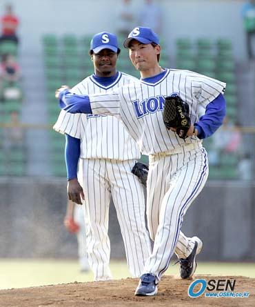 2일 삼성 라이온즈와 롯데 자이언츠의 경기가 열리기 전 삼성 투수 김현욱의 은퇴식이 열렸다.1993년에 삼성에 입단, 쌍방울을 거쳐 삼성으로 돌아온 김현욱은 13년간 519경기에 출장, 71승 31패 22세이브 54홀드를 기록했다. 김현욱이 시구자로 나와 바르가스 투수가 지켜보는 가운데 시구하고 있다./대구=손용호 기자 spjj@osen.co.kr [Copyright ⓒ OSEN(www.osen.co.kr) 무단전재 및 재배포 금지]