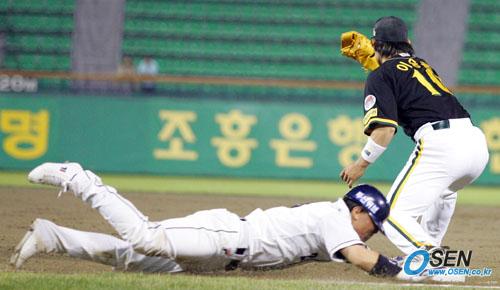 2일 두산 베어스와 현대 유니콘스의 잠실경기 두산의 6회말 1사 1루서 포수 용덕한이 2루 땅볼을 친 뒤 병살을 면하기 위해 전력 질주, 헤드퍼스트 슬라이딩으로 1루에 들어가 살고 있다./잠실=주지영 기자jj0jj0@osen.co.kr [Copyright ⓒ OSEN(www.osen.co.kr) 무단전재 및 재배포 금지]