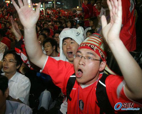 2006 독일월드컵 아시아 최종예선 A조 4차전을 서울 광화문 네거리에서 전광판을 통해 지켜보던 축구팬들이 후반 막판 한국의 박주영이 동점골을 넣자 기쁨을 만끽하고 있다./주지영 기자 jj0jj0@osen.co.kr [Copyright ⓒ OSEN(www.osen.co.kr) 무단전재 및 재배포 금지]