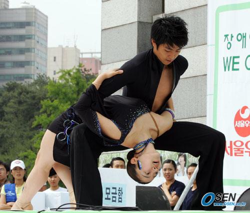 4일 오전 올림픽공원에서 스포츠스타들의 모임 ‘함께하는 사람들(회장 장윤창)’이 주최한 장애인과 함께하는 ‘2005 희망마라톤대회 식전행사에서 용인대 사회체육학과 스포츠댄스 전공 학생 둘이 삼바 공연을 펼쳐 보이고 있다. /주지영 기자 jj0jj0@osen.co.kr [Copyright ⓒ OSEN(www.osen.co.kr) 무단전재 및 재배포 금지]