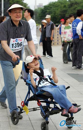 4일 오전 올림픽공원에서 열린 장애인과 함께하는 ‘2005 희망마라톤대회’에 참가한 한 장애 어린이가 아빠가 밀어주는 휠체어에 탄 채 즐거운 표정을 짓고 있다. /주지영 기자 jj0jj0@osen.co.kr [Copyright ⓒ OSEN(www.osen.co.kr) 무단전재 및 재배포 금지]