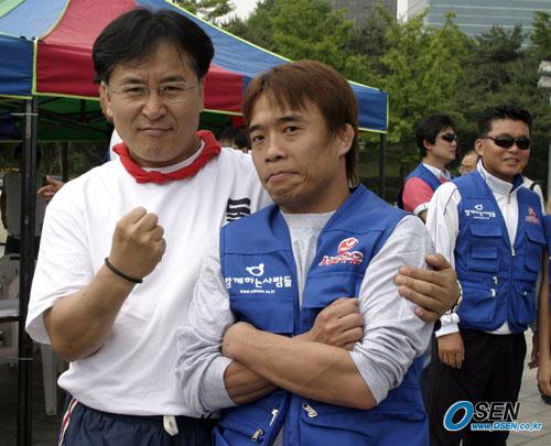 4일 오전 올림픽공원에서 열린 장애인과 함께하는 ‘2005 희망마라톤대회’에 앞서 1996년과 2000년 올림픽 레슬링 금메달리스트인 ‘함께 하는 사람들’회원 심권호가 대회 참가자와 함께 기념사진을 찍고 있다. /주지영 기자 jj0jj0@osen.co.kr [Copyright ⓒ OSEN(www.osen.co.kr) 무단전재 및 재배포 금지]