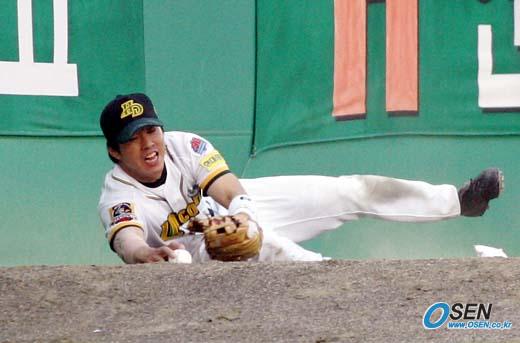4일 현대 유니콘스와 롯데 자이언츠의 수원 경기 3회초 1사 2,3루 손인호의 파울 플라이를 현대 유격수 채종국이 불펜의 마운드 위에서 잡은 뒤 넘어지고 있다. 이 사이 3루 주자는 태그업, 홈을 밟았고 채종국은 부상을 입어 교체됐./수원=손용호 기자 spjj@osen.co.kr [Copyright ⓒ OSEN(www.osen.co.kr) 무단전재 및 재배포 금지]