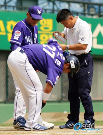 5일 잠실 구장에서 벌어진 LG 트윈스와 SK 와이번스의 경기 SK의 2회초 이호준이 LG 선발 투수 진필중의 투구에 팔을 맞자 트레이너가 달려 나와 스프레이를 뿌려주고 있다. 왼쪽은 박종훈 코치./잠실=주지영 기자jj0jj0@osen,co.kr [Copyright ⓒ OSEN(www.osen.co.kr) 무단전재 및 재배포 금지]