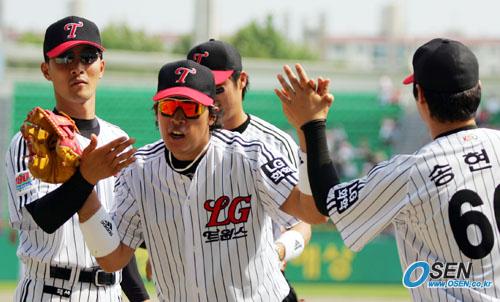5일 잠실 구장서 벌어진 LG 트윈스와 SK 와이번스의 경기 SK의 5회초 2사 후 LG 중견수 이병규가 이호준의 타구를 잘 잡아낸 뒤 덕아웃으로 돌아오면서 동료 선수들의 열띤 환영을 받고 있다. /잠실=주지영 기자jj0jj0@osen,co.kr [Copyright ⓒ OSEN(www.osen.co.kr) 무단전재 및 재배포 금지]