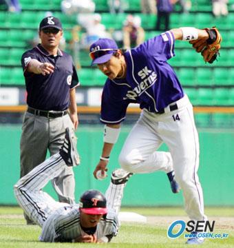 5일 잠실 구장에서 벌어진 LG 트윈스와 SK 와이번스의 경기 LG의 4회말 1사 1,3루서 이병규가 풀카운트서 삼진 당하는 순간 자동적으로 스타트를 끊은 1루 주자 한규식이 2루로 가다 멈춰 돌아오던 중 포수의 송구를 받은 SK 유격수 김민재에게 태그 아웃되고 있다./잠실=주지영 기자 jj0jj0@osen,co.kr [Copyright ⓒ OSEN(www.osen.co.kr) 무단전재 및 재배포 금지]