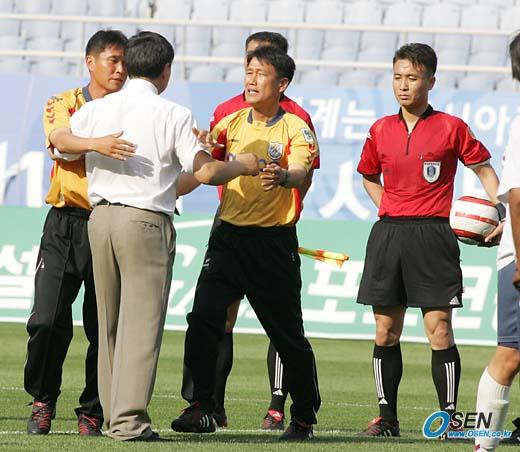 5일 인천 문학 월드컵경기장에서 열린 인천 유나이티드와의 경기서 1-0으로 앞서던 전반 이창원이 경고 2회로 퇴장당한 뒤 10명을 싸운 끝에 1-3으로 역전패한 전남 드래곤즈의 허정무 감독(왼쪽에서 두 번째)이 경기 후 그라운드 중앙으로 나와 심판의 판정이 편파적이었다고 항의하자 김봉길 코치(왼쪽)와 최진한 코치가 따라 나와 말리고 있다./인천=손용호 기자 spjj@osen.co.kr [Copyright ⓒ OSEN(www.osen.co.kr) 무단전재 및 재배포 금지]
