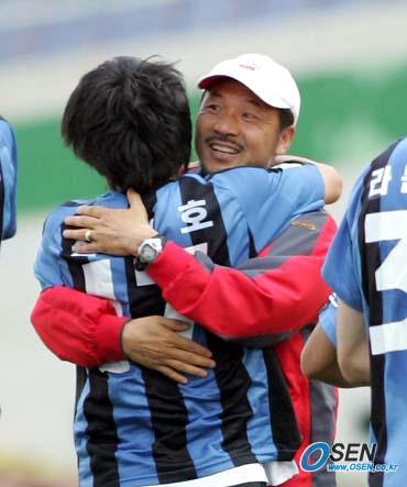 5일 인천 문학 월드컵경기장에서 열린 인천 유나이티드와 전남 드래곤즈의 경기서 후반 역전 결승골을 넣은 전재호가 장외룡 감독에게 달려가 포옹하고 있다. 인천이 전남에 3-1로 역전승을 거두고 정규리그 4전 전승을 기록했다./인천=손용호 기자 spjj@osen.co.kr [Copyright ⓒ OSEN(www.osen.co.kr) 무단전재 및 재배포 금지]