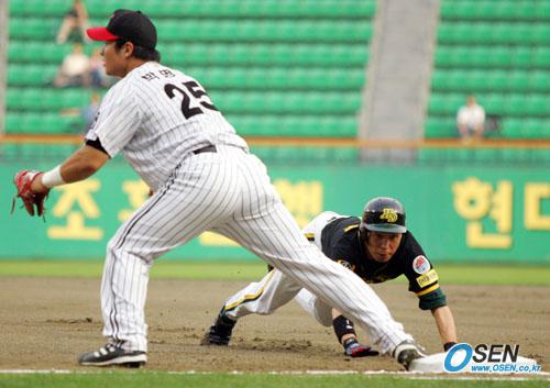 7일 LG 트윈스와 현대 유니콘스의 잠실 경기 1회초 무사 1루서 정수성의 보내기 번트가 플라이볼이 되자 전준호가 2루로 스타트를 끊었다 되돌아 왔으나 포스아웃되고 있다./잠실=주지영 기자 jj0jj0@osen.co.kr [Copyright ⓒ OSEN(www.osen.co.kr) 무단전재 및 재배포 금지]