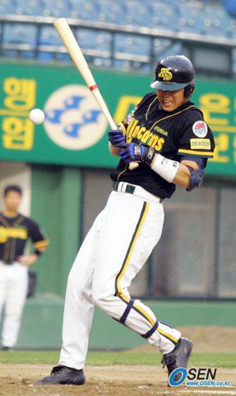 7일 LG 트윈스와 현대 유니콘스의 잠실 경기 5회초 현대의 선두 타자 채종국이 LG 선발 투수 유택현의 투구에 맞고 있다./잠실=주지영 기자 jj0jj0@osen.co.kr [Copyright ⓒ OSEN(www.osen.co.kr) 무단전재 및 재배포 금지]