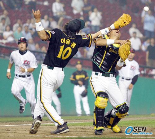 7일 LG 트윈스와 현대 유니콘스의 잠실경기 LG의 7회말 2사 만루서 조인성이 친 내야 높은 플라이볼을 현대 1루수 이숭용과 포수 김동수가 서로 잡으려다 놓치자 3루를 돌아 홈으로 향하던 2루 주자 정의윤(왼쪽)이 눈에 불을 켜고 달리고 있다. /잠실=주지영 기자 jj0jj0@osen.co.kr [Copyright ⓒ OSEN(www.osen.co.kr) 무단전재 및 재배포 금지]