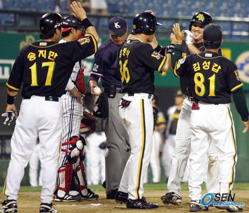 8일 LG 트윈스와 현대 유니콘스의 잠실경기에서 8회초 2사 만루에서 서튼이 역전 결승 만루 홈런을 치고 들어오자 홈으로 들어온 1,2,3루 주자들과 서튼이 홈에서 기뻐하고있다./잠실=주지영 기자 jj0jj0@osen.co.kr [Copyright ⓒ OSEN(www.osen.co.kr) 무단전재 및 재배포 금지]