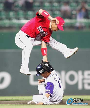 8일 인천 문학 구장에서 열린 SK 와이번스와 기아 타이거즈의 경기. SK의 7회말 공격, 2사 1루서 1루 주자 조동화가 김민재 타석 때 2루 도루를 시도, 기아 포수 김상훈의 송구가 높아 성공하는 듯했으나 아웃되고 있다. 기아 유격수는 김종국. /인천=손용호 기자 spjj@osen.co.kr [Copyright ⓒ OSEN(www.osen.co.kr) 무단전재 및 재배포 금지]
