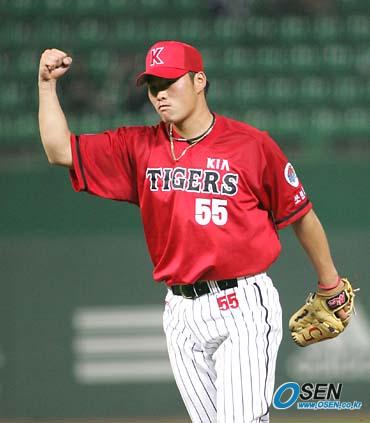 9일 문학구장에서 열린 SK 와이번스와 기아 타이거즈의 경기서 기아의 선발 투수 김진우가 7이닝을 6피안타 1실점으로 막아내고 시즌 2승째를 거두었다. 1-1이던 6회말 2사 2,3루에서 박경완을 삼진으로 처리한 김진우가 주먹을 불끈쥐고 있다. 기아는 여전히 1-1에서 맞은 8회초 대거 5점을 뽑아 김진우가 승리 투수의 요건을 갖췄다./인천=손용호 기자 spjj@osen.co.kr [Copyright ⓒ OSEN(www.osen.co.kr) 무단전재 및 재배포 금지]