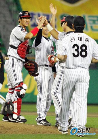 9일 LG 트윈스와 현대 유니콘스의 잠실경기서 LG가 투수전 끝에 2-1로 이겼다. 3명의 투수와 배터리를 이뤄8안타를 허용하고도 1실점으로 막는 투수 리드로 승리에 기여한 LG 고참 포수 김정민이 후배들과 승리의 기쁨을 나누고 있다. 신재웅(오른쪽 끝)은 2⅓이닝 무실점으로 경기를 마무리하며 승리 투수가 된 반면 현대 선발 김수경은 8이닝을 6피안타 2실점으로 호투했으나 완투패를 당했다./잠실=주지영 기자 jj0jj0@osen.co.kr [Copyright ⓒ OSEN(www.osen.co.kr) 무단전재 및 재배포 금지]