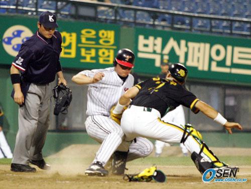 9일 LG 트윈스와 현대 유니콘스의 잠실경기서 1-1이던 8회말 2사 1,3루 박병호 타석 때 현대 투수 김수경이 1루주자 박용택에게 견제구를 던지는 사이 3루주자 이성렬이 포수 김동수의 태그에 앞서 홈을 밟고 있다./잠실=주지영 기자 jj0jj0@osen.co.kr [Copyright ⓒ OSEN(www.osen.co.kr) 무단전재 및 재배포 금지]