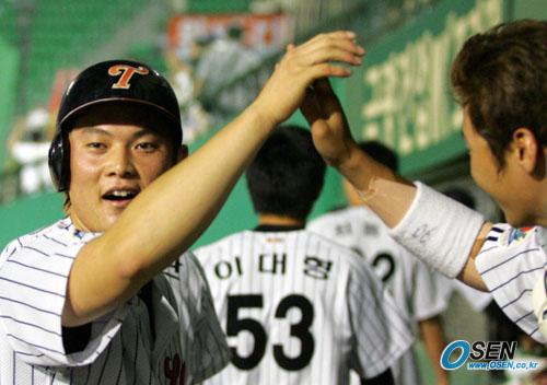 9일 LG 트윈스와 현대 유니콘스의 잠실경기서 1-1이던 8회말 2사 1,3루서 현대 투수 김수경이 1루에 견제구를 던지는 사이 홈으로 대시, 결승점을 올린 LG의 이성렬(왼쪽)이 1루 주자였던 박용택과 덕아웃에서 손을 마주치며 좋아하고 있다./잠실=주지영 기자 jj0jj0@osen.co.kr [Copyright ⓒ OSEN(www.osen.co.kr) 무단전재 및 재배포 금지]