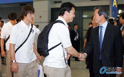 6회 연속 월드컵 본선 진출에 성공한 국가대표 축구팀이 10일 아침 인천공항을 통해 개선했다. 이운재 등 선수들이 입국장을 빠져 나오자 정몽준 대한축구협회장이 일일이 악수를 나누며 환영하고 있다./인천공항=주지영 기자 jj0jj0@osen.co.kr [Copyright ⓒ OSEN(www.osen.co.kr) 무단전재 및 재배포 금지]