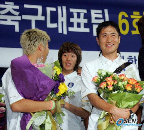 6회 연속 월드컵 본선 진출에 성공한 국가대표 축구팀이 10일 아침 인천공항을 통해 개선했다. 꽃다발을 손에 쥔 이영표가 동료들과 함께 기념 촬영하며 활짝 웃고 있다./인천공항=주지영 기자 jj0jj0@osen.co.kr [Copyright ⓒ OSEN(www.osen.co.kr) 무단전재 및 재배포 금지]