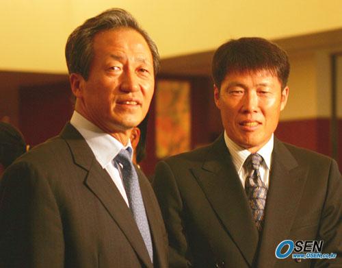 10일 저녁 서울 삼성동 코엑스 인터콘티넨털호텔에서 열린 최용수의 결혼식에 정몽준 대한축구협회장(왼쪽)과 98년 프랑스월드컵에 최용수를 주전 스트라이커로 기용했던 차범근 수원 삼성 감독이 참석, 자리를 빛내 줬다./주지영 기자 jj0jj0@osen.co.kr [Copyright ⓒ OSEN(www.osen.co.kr) 무단전재 및 재배포 금지]