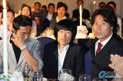 10일 아침 2006 독일월드컵 티켓을 따내고 인천공항을 통해 개선한 국가대표 미드필더 박지성(가운데)이 저녁에 서울 삼성동 코엑스 인터콘티넨털호텔에서 열린 최용수의 결혼식에 참석, 김대의(왼쪽) 최성용 등 선배들과 한 테이블에 앉아 식을 지켜보고 있다./주지영 기자 jj0jj0@osen.co.kr [Copyright ⓒ OSEN(www.osen.co.kr) 무단전재 및 재배포 금지]